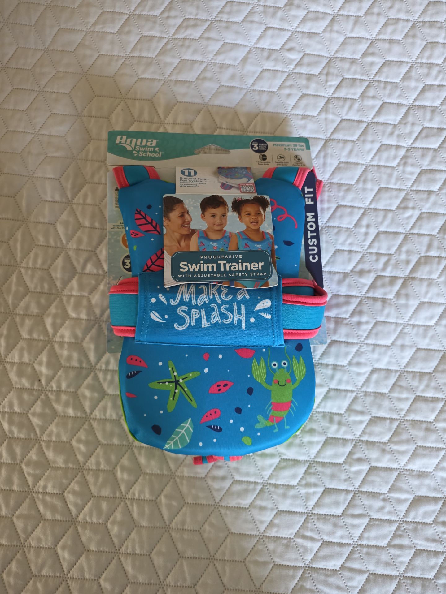 Aqua Swim School progressive swim trainer with adjustable safety strap. 11 bouyant foam pad system. Remove foam pads as swimming skills progress. Level 3 refine swim skills. Maximum 38 lbs. Ages 3-5 yrs.