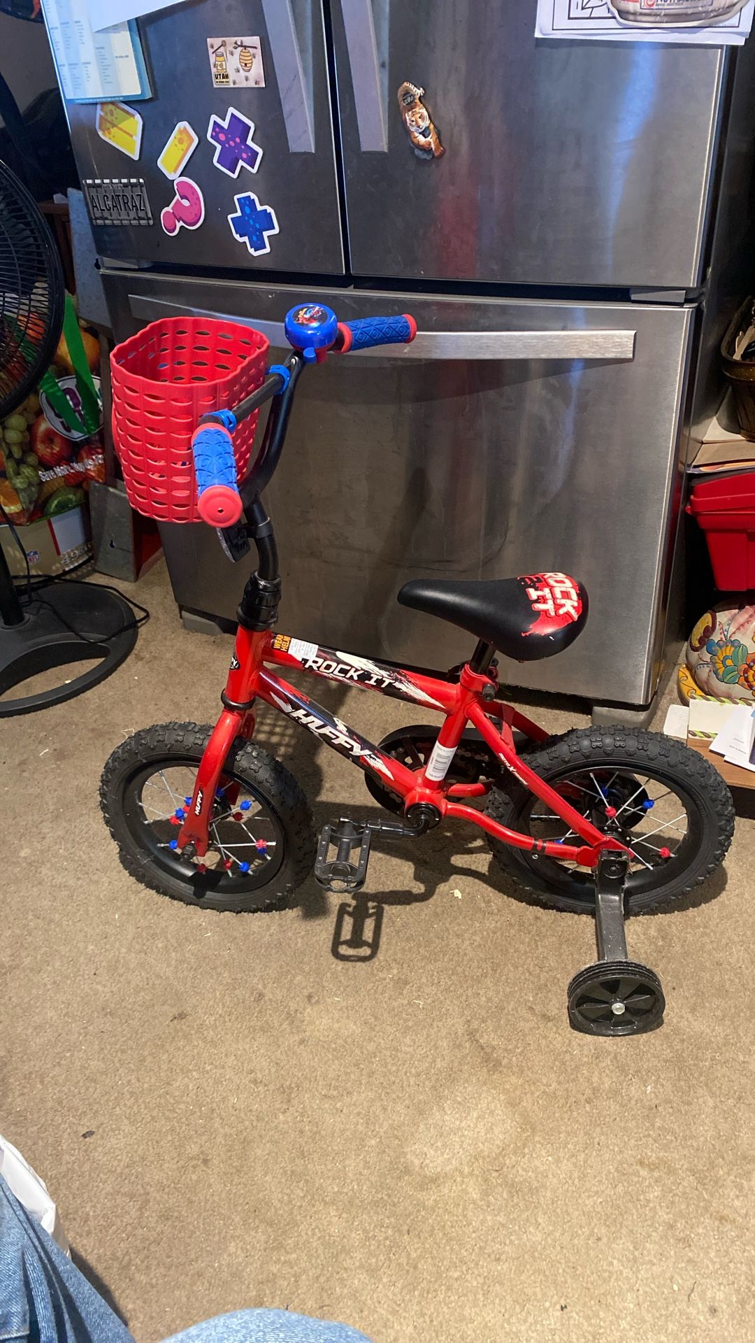 Kids Spider Man bike with training wheels, bell and basket.