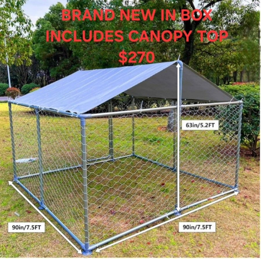 Brand new in box 7.5 x 7.5 x 5.2 ft large dog kennel with galvanized metal frame. Lockable door, water proof tarp, anti ultraviolet tarp roof cover. Great for sun and heat protection. Easy wrap around assembly. Just over 5 ft tall with Apex Frame. Great for garden fence , dog run, animal cage , pigs, goats chickens, puppies , xl dogs, coyote protection. I offer dog crates, houses, playpens whelping boxes as well. Please see my page. Jaulas de mascota