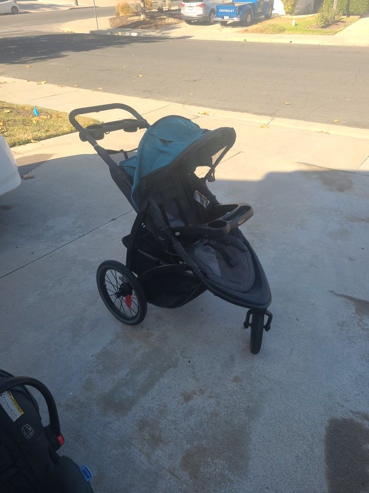 Used snugride snuglock 30 carseat. Unsure of the model of the stroller but the carseat and stroller go together. Great for jogging and walking!