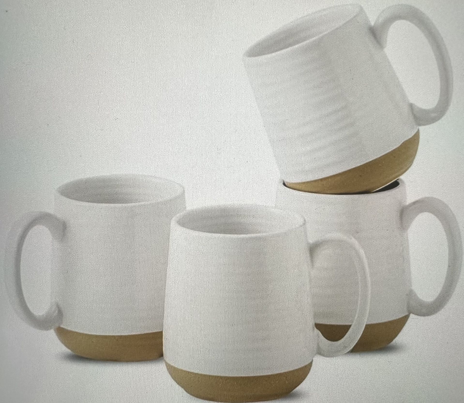 Elevate your dining experience with this elegant set of white and tan ceramic mugs. Perfect for enjoying your favorite beverages. 15 oz ceramic cups. Great grip and dishwasher, microwave safe!