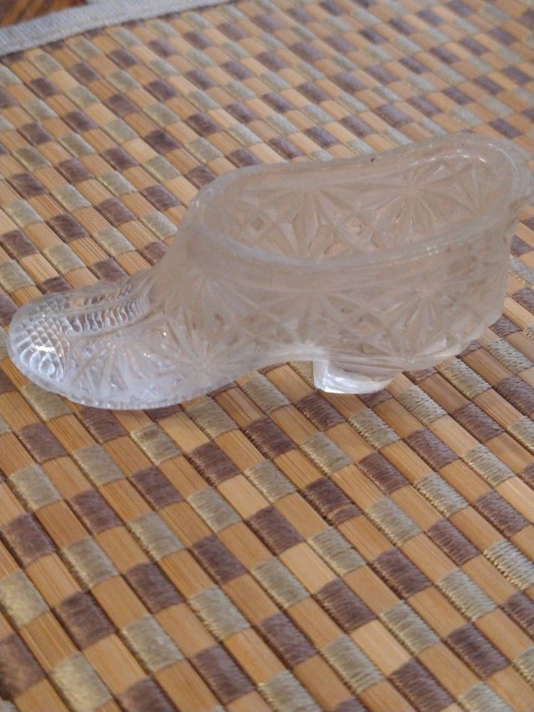 This item is a vintage Fenton art glass slipper in clear glass featuring the iconic Daisy and Button pattern. Manufacturer: Fenton Art Glass Company, West Virginia, USA. Pattern: Daisy and Button. Type: Pressed glass figurine or vanity item. Era: Mid-20th century. Please check out my other items!