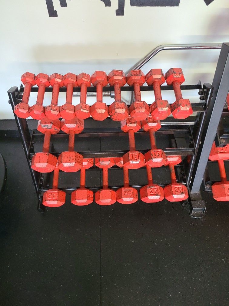Selling dumbbells from 10-85lbs. Plus two dumbbell racks. Will sell separate or altogether.