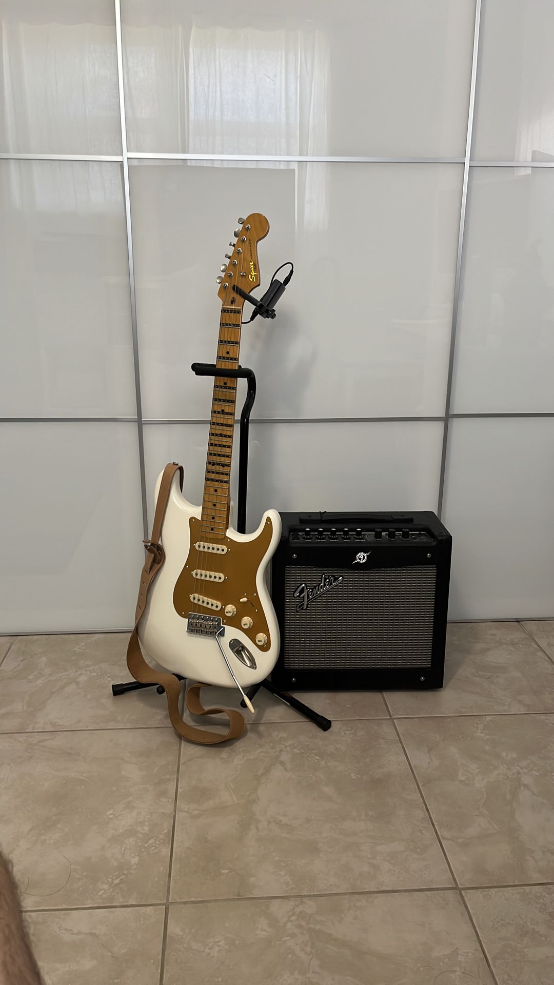 This is a barely used Fender Squier Stratocaster with a Mustang V2 amp. I’ve probably used them less than 25 times. Been sitting in a closet for a while. Everything works.. it has some kind of led thing Fret Zealot that I wasn’t able to make work. It’s just like a decal you can peel off if you don’t want it. I have the cable somewhere I can find it and include it. I even have an Xbox one game that lets you hook it up. You can have that too.