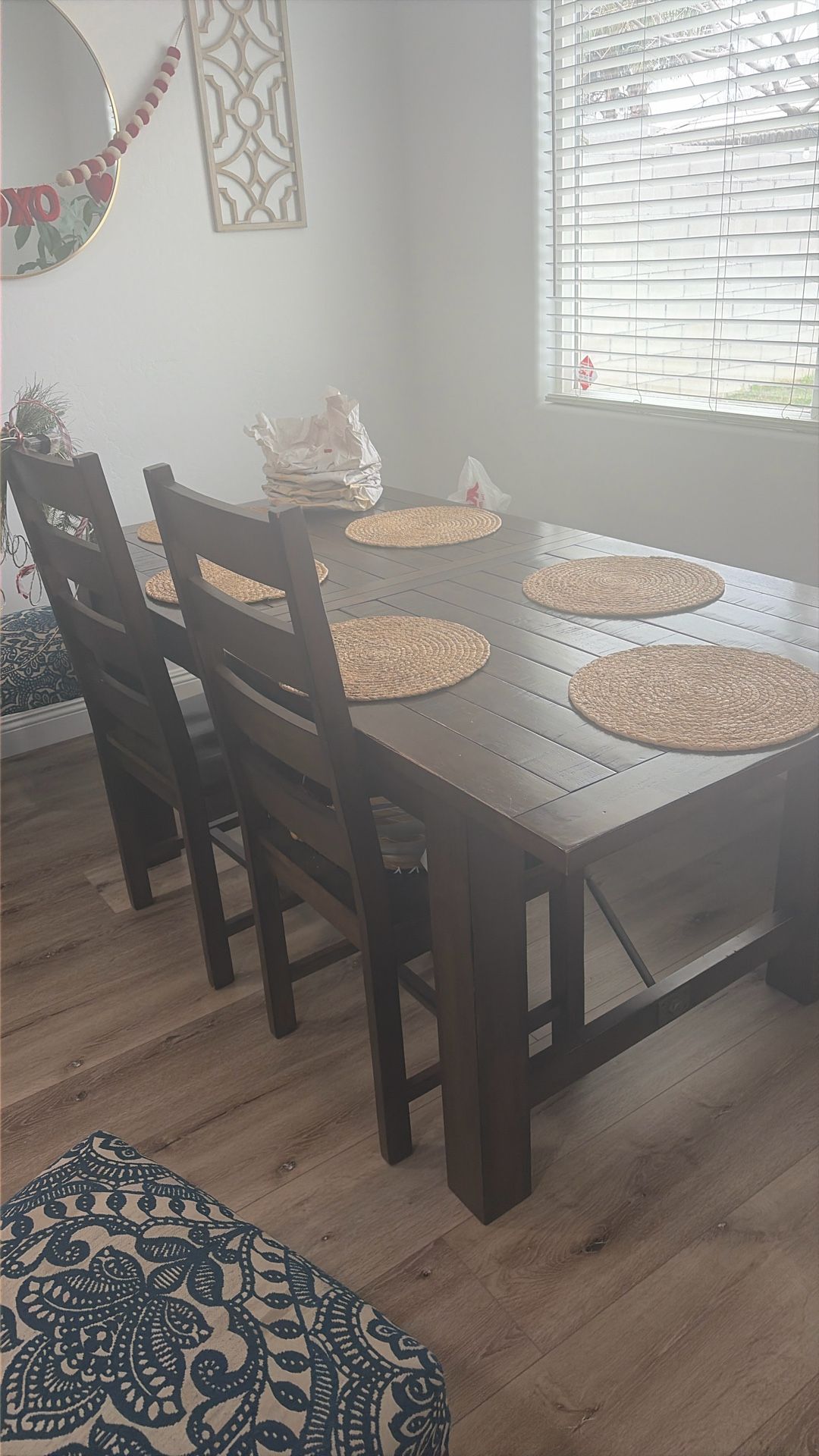6ft long with a table extender, possibly extending up to 7ft long 3ft wide. Comes with Two wood chairs and wood bench, table can extend to accommodate up to eight sitting s.