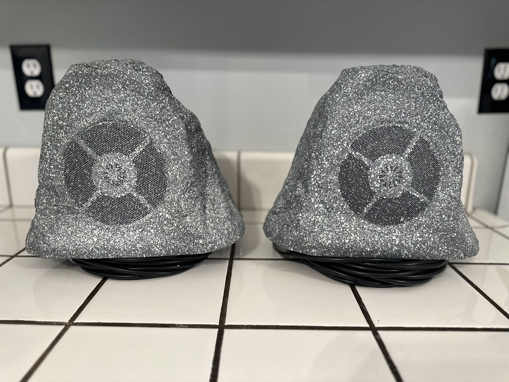 These outdoor Rock Speakers are ideal for your front or back yard , by the pool , hot tub , Flower beds or on your patio they are water proof and sound amazing. They come wired and ready to go. Bought stored but never used.