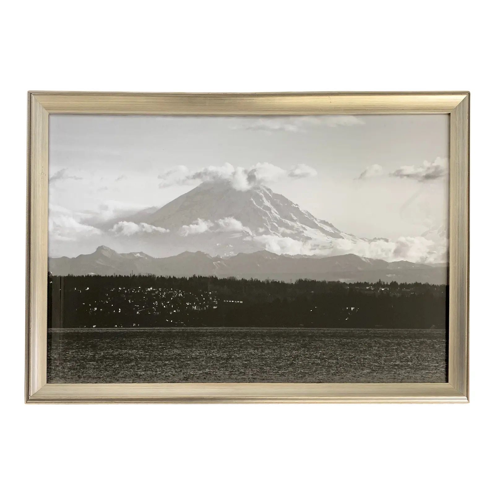 Photograph of Mt. Rainier from Seward Park, Seattle, Washington. Framed in a silver-tone wood frame. The photo was taken by the seller in 2019 39.25ʺW × 1.75ʺD × 26.25ʺH