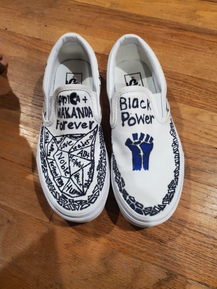 My son saw Wakanda Forever, and got inspired to create on his Van's that he can no longer fit. So check out his design and show some love even if you don't buy. Thanks for looking