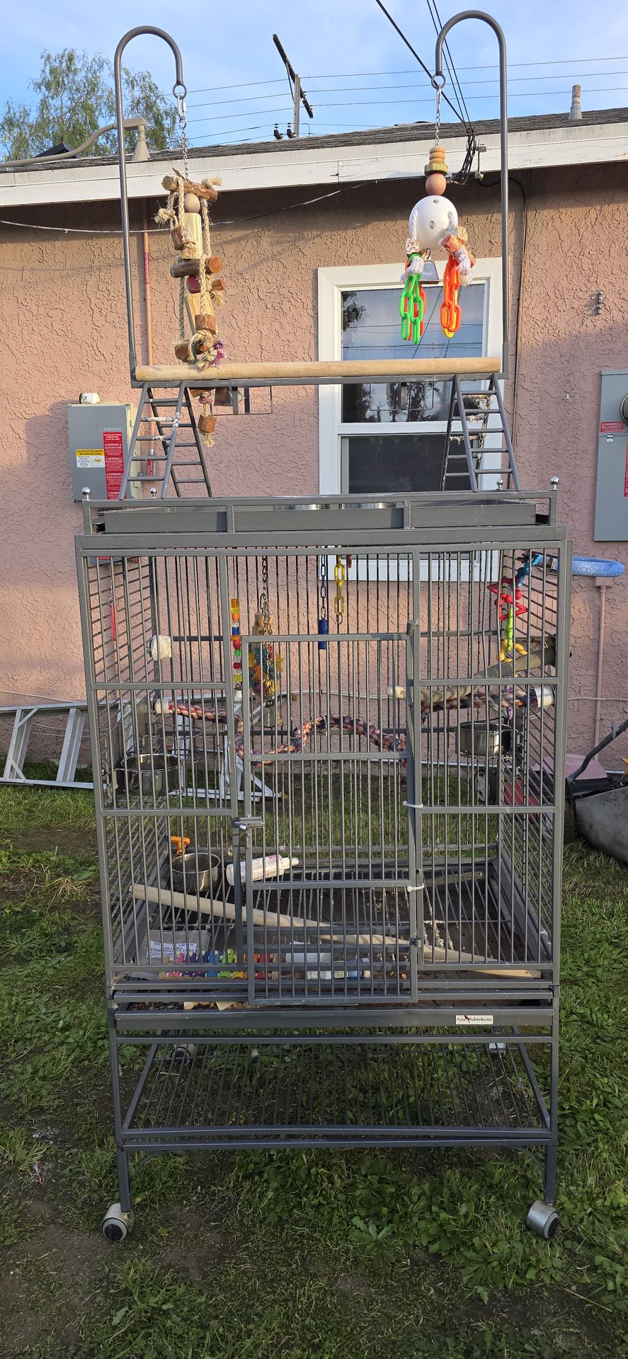 Large bird cage that was given to me. Dont need it. So hopefully it finds a home. Needs a little bit of tlc but its complete. The door has broken hinges and is held on with zip ties and 1 canster wheel is loose. Nothing a hand man can't fix. Comes with all the accessories you see in the picture. Shoot me an offer.
