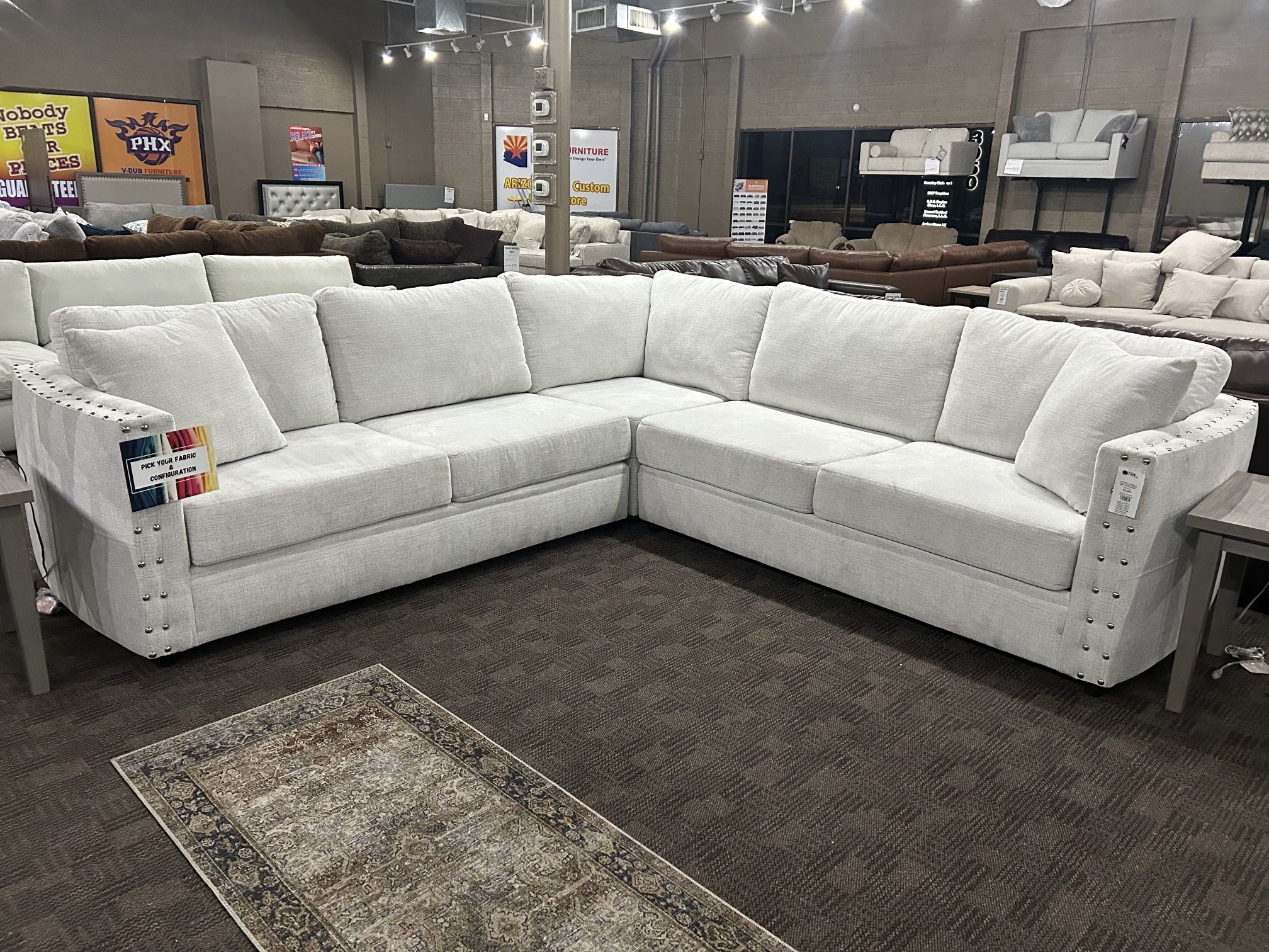 Brand new custom sectional. Soft white fabric, deep, comfortable seating. Measures 10’ by 10’. Silver nailhead accents. Delivery and financing available.