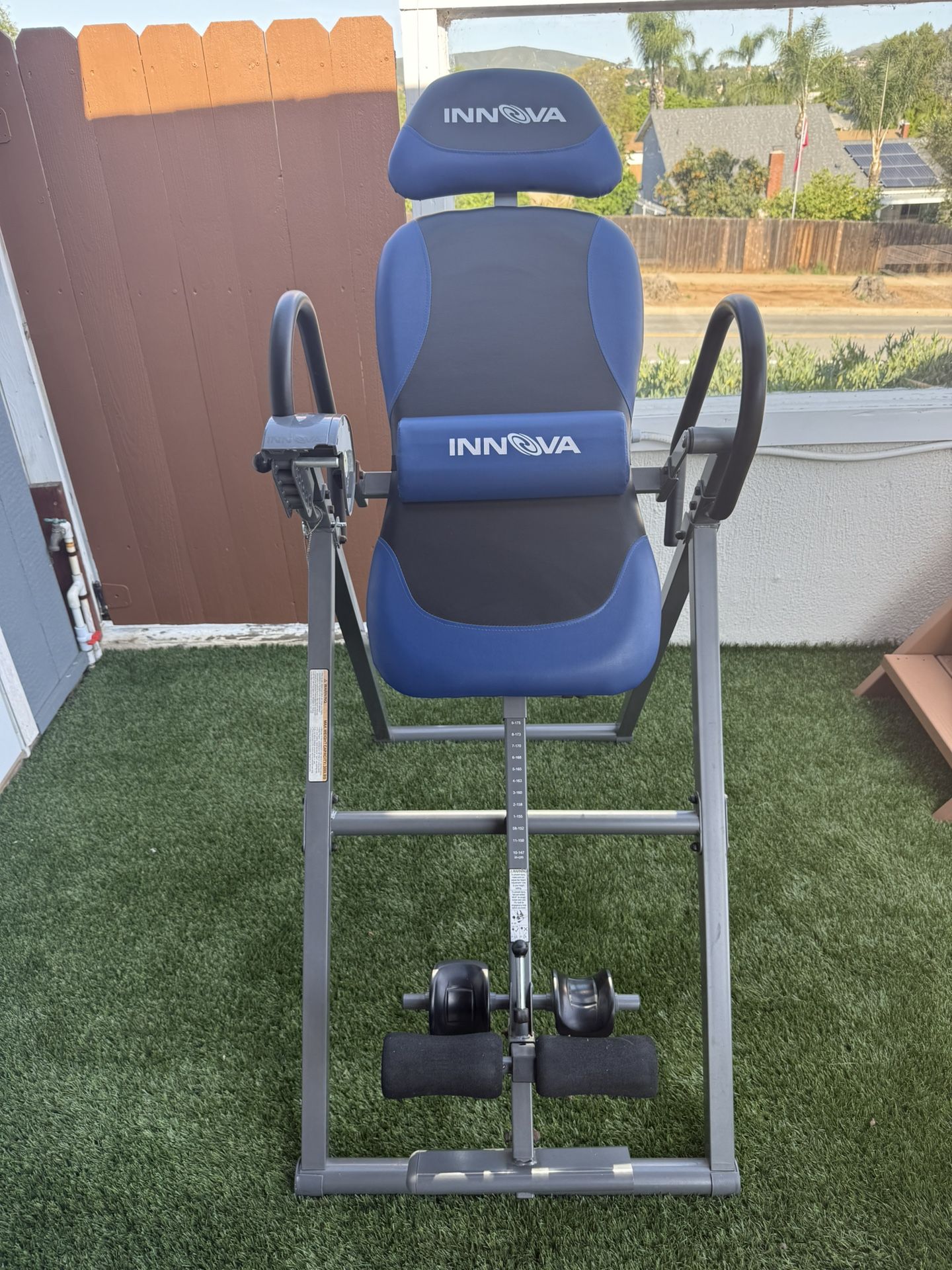 Innova ITX9400 Heavy Duty Deluxe Inversion Table • Ergonomic and Reversible Ankle Holding System (Ankle Holders can trade places) • True Balance System for easy inverting • Six (6) Position Adjustable Pin System with added Patented Protective Cover for easy positioning • Large, Comfortable Backrest with Adjustable Headrest • Accommodates users 4ft-10in to 6ft-6in with a 300 lb Weight Capacity • Consult with a licensed physician before using this inversion table. Some medical conditions may not be suitable for use with this product. Disclaimer: inversion tables are intended to provide immediate and lasting back relief, but may not work for all customers, we cannot guarantee pain relief with the purchase of this product Although we strive to ensure all product details and information is accurate, there may be slight variations by the manufacturer. Innova Health and Fitness, Model ITX9400 The Innova ITX9400 is a heavy-duty inversion table that comes with many features that set it apart from other inversion tables. Starting with its large backrest, adjustable headrest, and soft touch foam handlebars, it provides a comfortable, easy inversion. But these are just the basics. The ITX9400’s True Balance System allows each user to find their own unique center of gravity. The Six Angle Pin System allows users to trust that the ITX9400 will easily, safely, and consistently deliver on the finest inversion experience. True Balance System - Triple Adjustment Structure Unlike other inversion tables, which only have one adjustable part, the ITX9400’s True Balance System has three adjustable features, to help each individual user find the smoothest and most comfortable inversion experience for them. The True Balance Structure allows users to adjust the headrest, the height, and the footrest to micromanage the center of gravity. The 6-Angle Pin System with Protective Cover The ITX9400 also includes a patented protective cover for the easy to adjust six angle pin system. Just position the pin in the desired slope and know that your inversion position will be safe, comfortable, and consistent every time. Old tether strap systems require the user to dismount entirely and climb underneath the table in order to adjust and can loosen after repeated use.