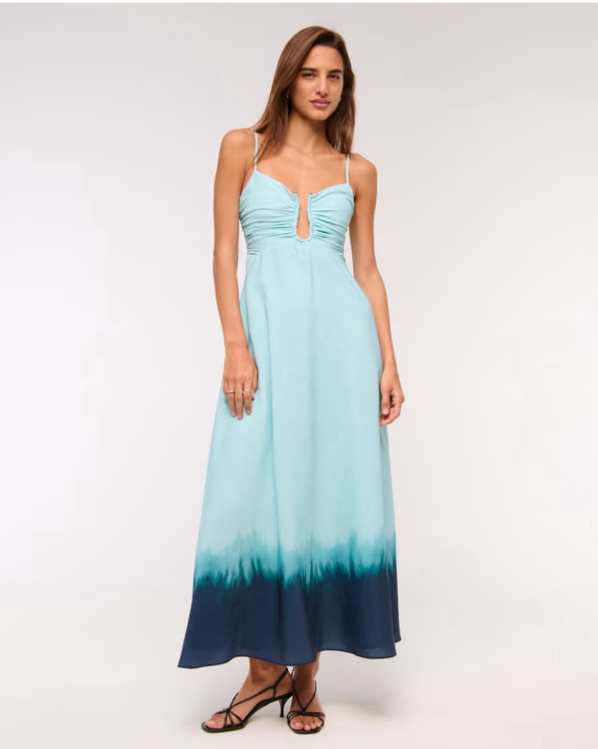 New with tags. Abercrombie and fitch Bra-Free Hardware Maxi Dress. Size large. Color is Turquoise Pattern. Did not end up wearing for party.