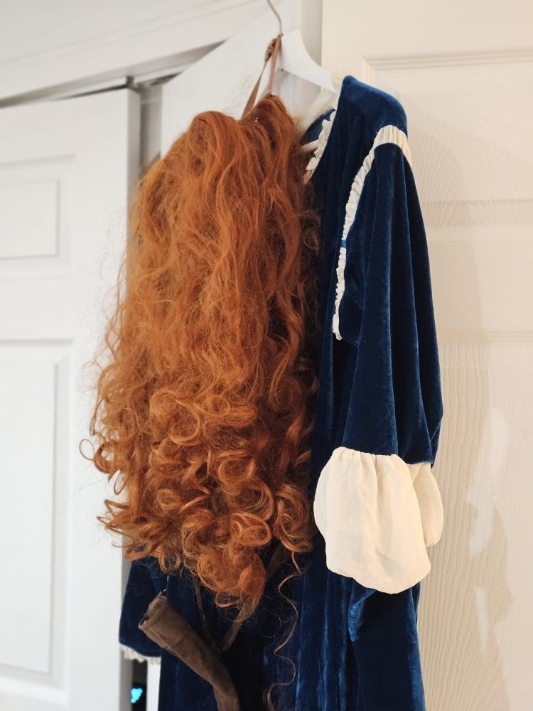 Princess Merida from Brave dress & wig. Velvet dress, cotton accents, curly wig, archery bag accessory. Used only once. Measurements: Bust 100cm 39.37in Waist 80cm 31.49in Hips 105cm 41.33in Dress Cosplay Costume Adult Halloween Party Costume Princess Merida