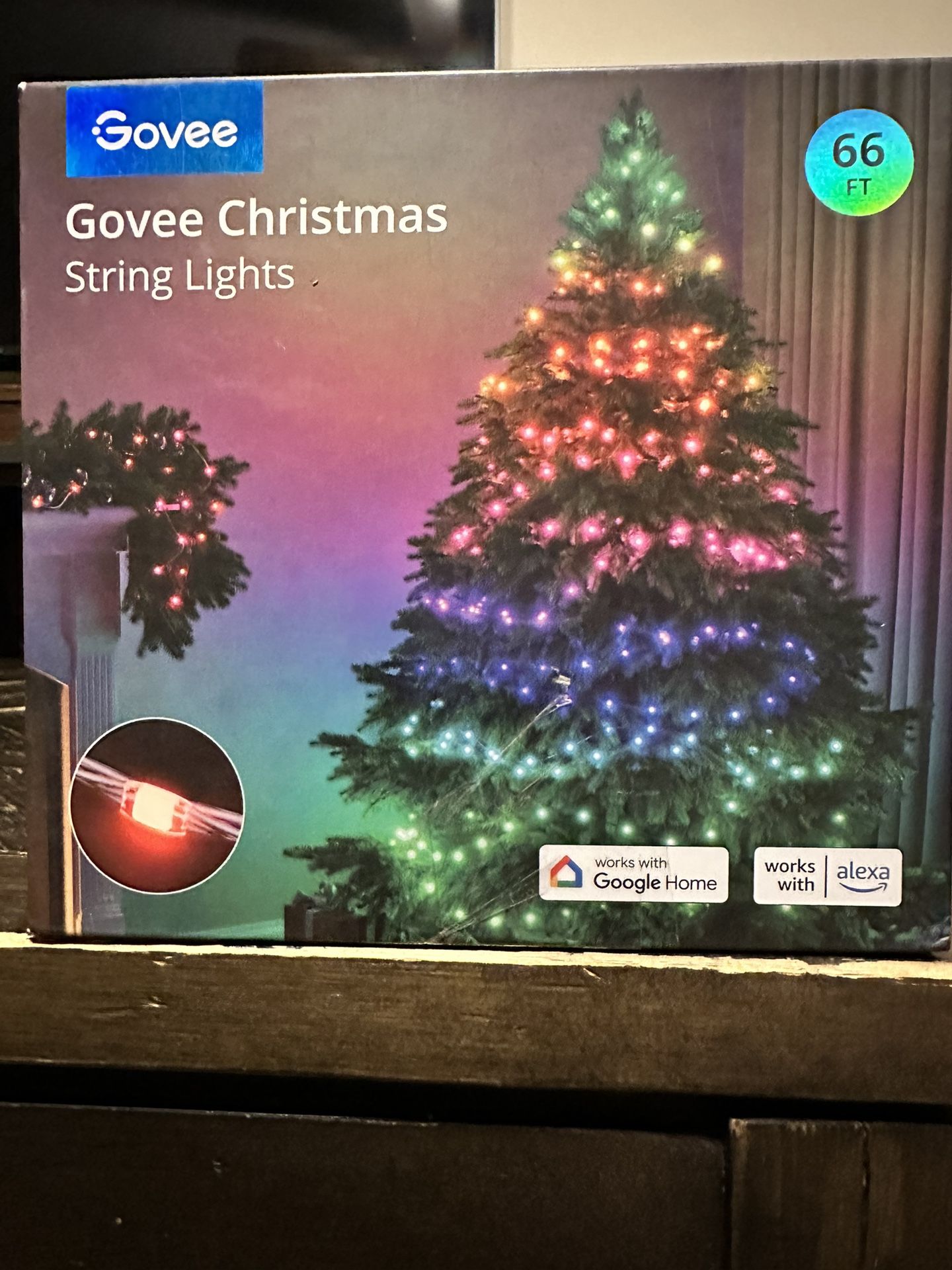 Govee Christmas Lights 66ft, Smart RGBIC String Lights App-Controlled, 125+ Scene Modes, IP65 Waterproof, Sync with Music, Works with Alexa, Holiday Party Decorations Indoor Outdoor Indoor Outdoor Usage Indoor Additional Features 125+ Preset Scene Mode, IP65 Waterproof (Note:The adapter is not waterproof), RGBIC Lighting Effects, Smart APP & Voice Control, Uni-IC DIY Control Light Source Type LED Power Source Corded Electric Light Color 16 million colors Controller Type App Control, Voice Control Connectivity Protocol Bluetooth, Wi-Fi Connectivity Technology Bluetooth, Wi-Fi Voltage 5 Volts (DC) Wattage 15 watts Control Method Voice Water Resistance Level Waterproof What's in the box: Govee Christmas String Lights 66ft x 1 Power Adapter x1 User Manual x 1