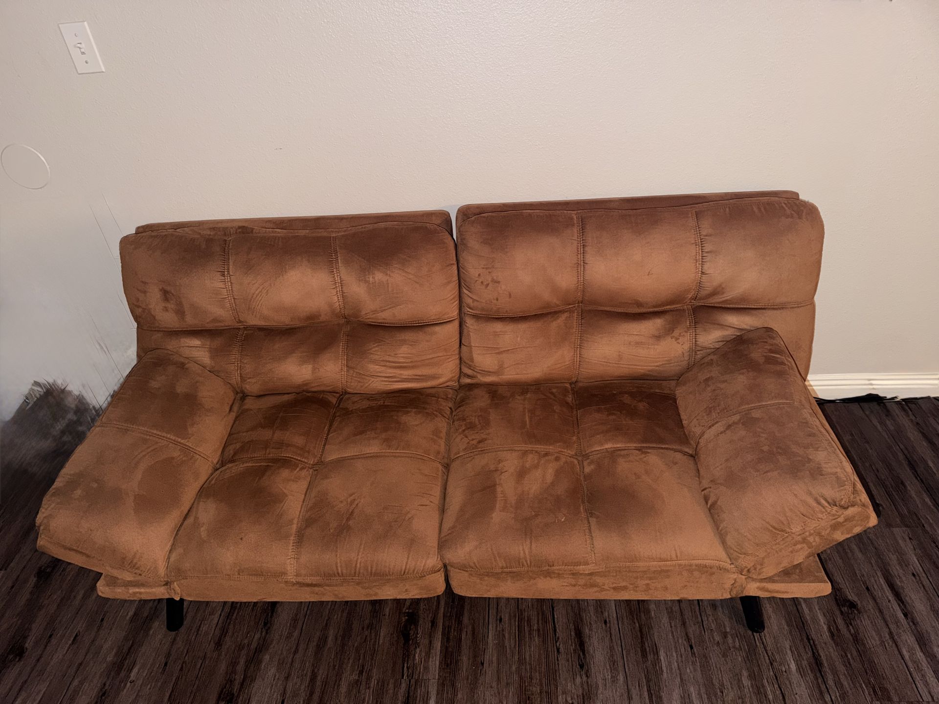 Brown Suede/Microfiber Sofa β Comfortable & Stylish Comfortable 3-seat sofa in a warm brown suede/microfiber material. Super plush cushions with a soft feel and supportive backrests. Wide padded armrests make it perfect for relaxing, watching TV, or lounging. Modern look with dark angled legs that pair well with most living room styles. Clean and sturdy, with normal wear consistent with use (see photos). Great for a living room, apartment, office, or game room. Message me if interested!