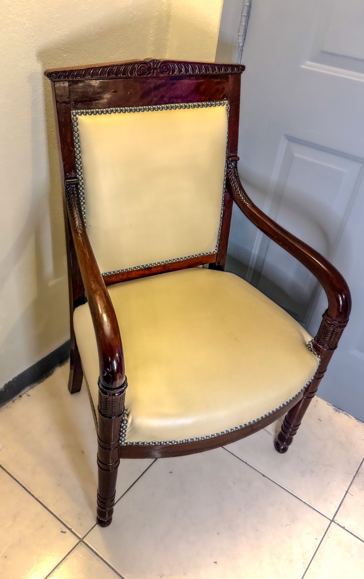Provisional French/Italian styled Accebt chair perfectly upholstered una creamy comfortable leather . Dorsnt fit the MCM style I’m going for! But it’s Gorgeous and yours to pick up in Miami! Similar Antique pieces are priced at over $700 each and all I’m among is $99, so come get it before i change my mind to keep it! 🤗
