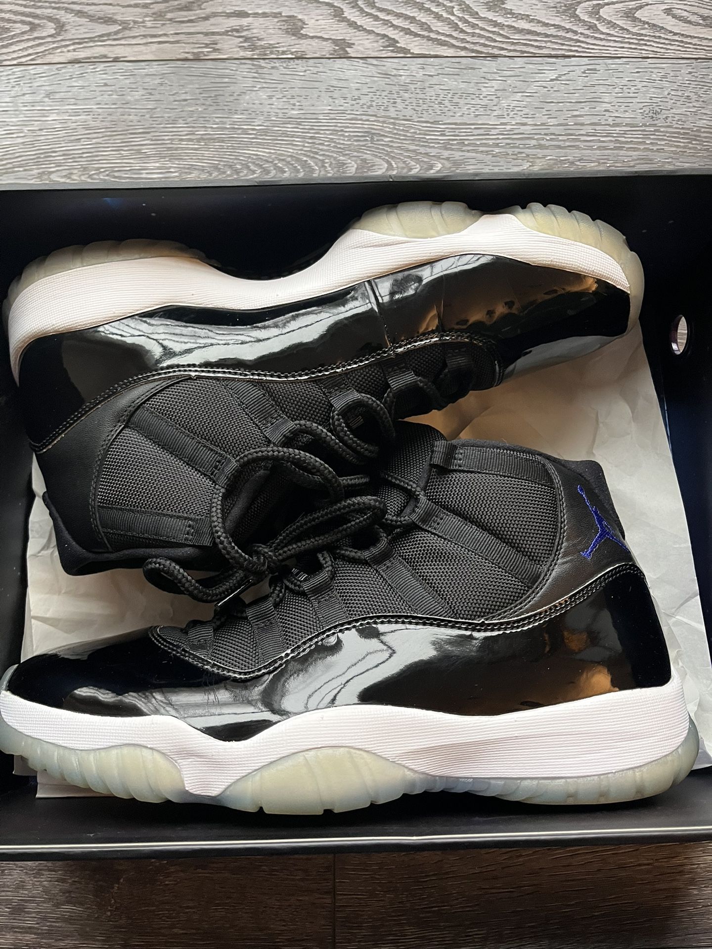 Air Jordan 11 Space Jam – Used (Great Condition) Worn but still in very good condition. Patent leather is clean and shiny. Minimal creasing. Soles still icy with light wear. No major flaws. 100% authentic. Comes with box.