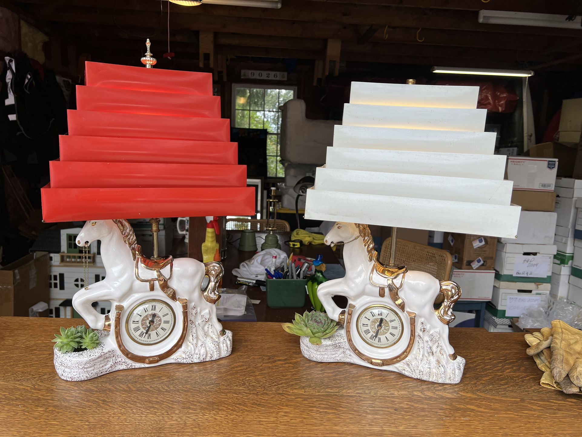 Truly amazing lamps with metal, pleated shades and clocks that work. Very good condition. Includes the pair or $400 for just one