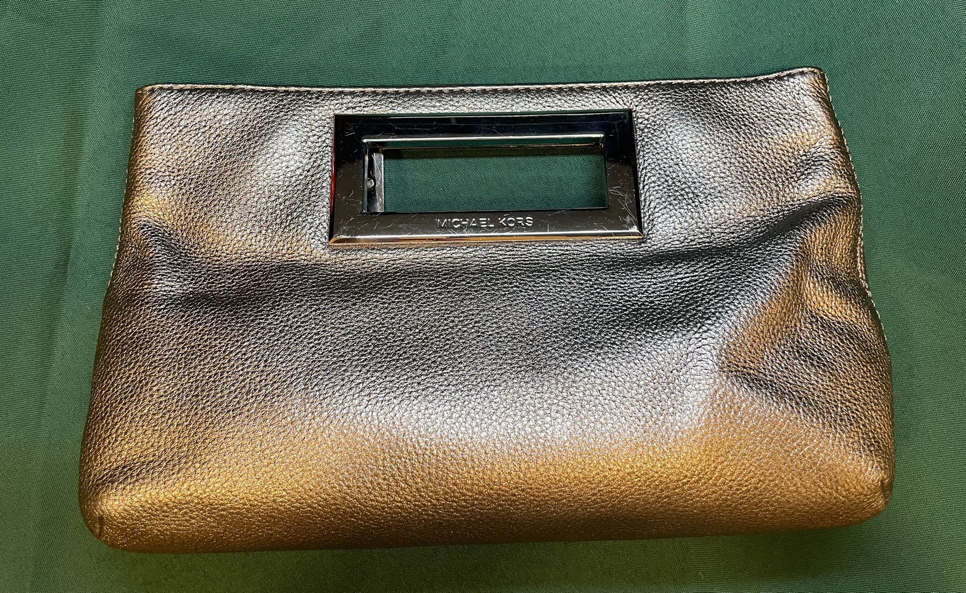 Chic metallic leather clutch with sleek design. Features signature Michael Kors logo. Ideal for evening outings. Beautiful soft pebbled leather with silver hardware. Some scratches on silver hardware but does not take away from the elegance and beauty of this bag
