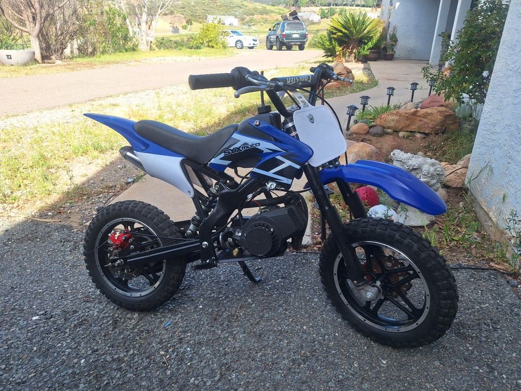 Pull-start 49cc engine with a 24" seat height: 5 year old and up should be able to reach floor. Bike weighs less than 60lbs and has front and rear disc brakes activated by smaller kid-friendly handles. Max rider weight is 175lbs. Rebuilt last month, replacing pull start, carburetor, ignition coil, spark plug, Starts first pull and can go upwards of 30mph without speed limiter. Fun little rocket.