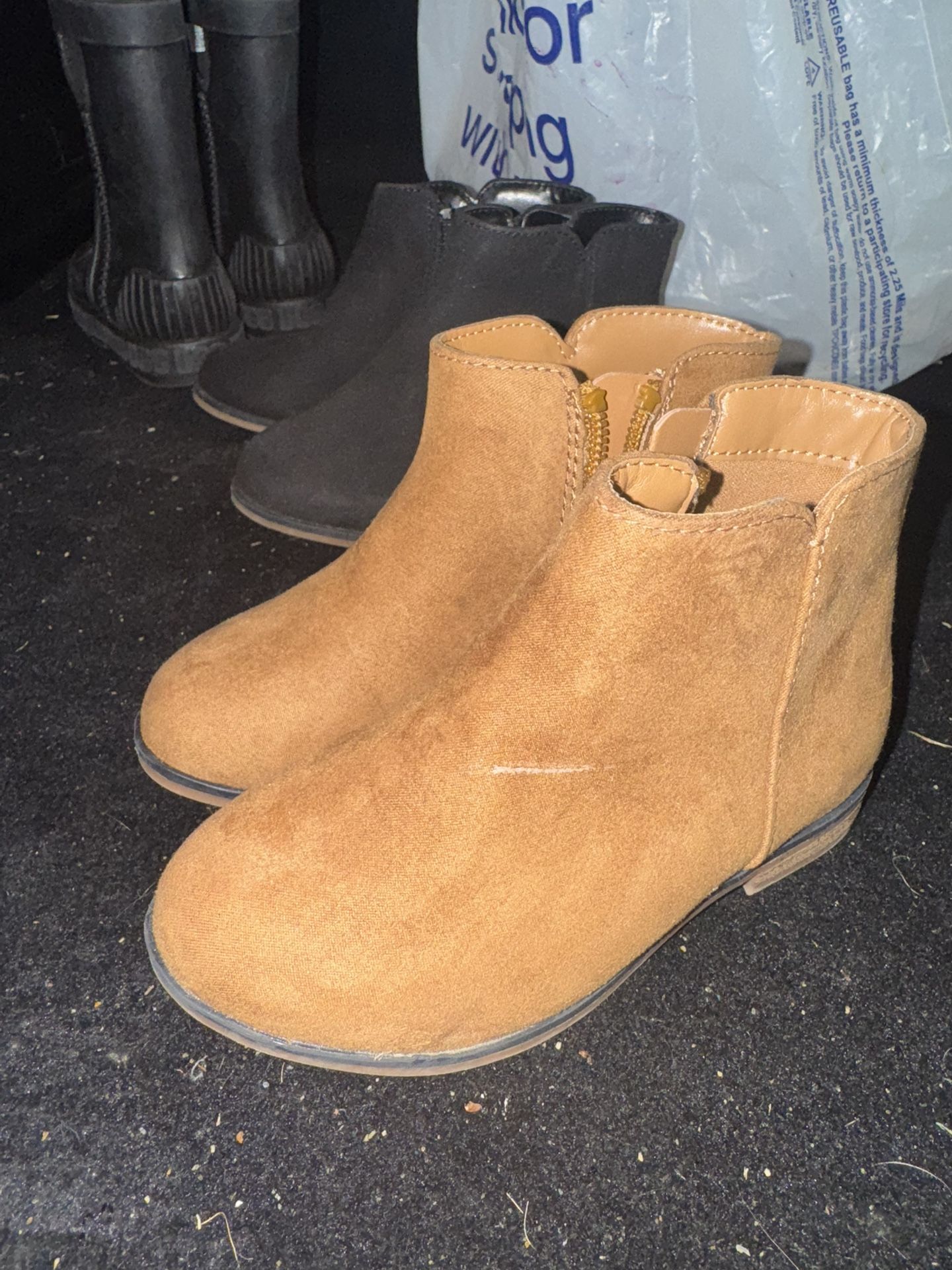 Girls toddler boots ALL size 8C 3 for $20. Tan & black boots are from Target and black boots are rainboot UGGS. Nothing wrong with the black UGGS it’s the rain boot material that makes them look super worn. Pet free home Smoke free home