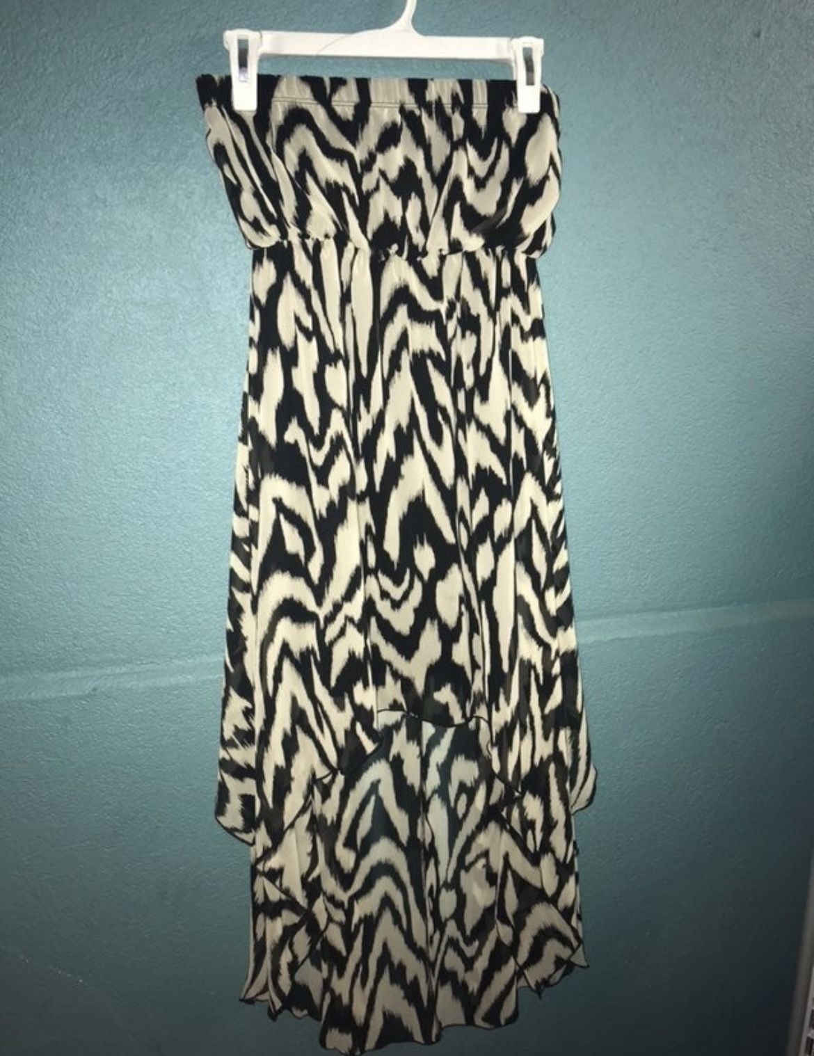 Very pretty flowy dress from Windsor. Black and white. Above the knee in the front. Long past the knee in the back. Black layer underneath. Strapless size medium