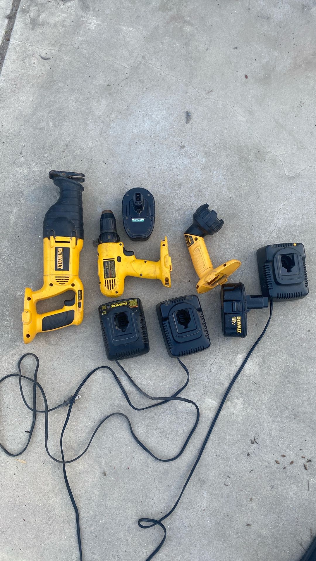 DeWalt tools, drill saw saw and flash light. Asking $150 for all chargers and batteries. Battery doesn’t hold charge for a long time but tools work fine.