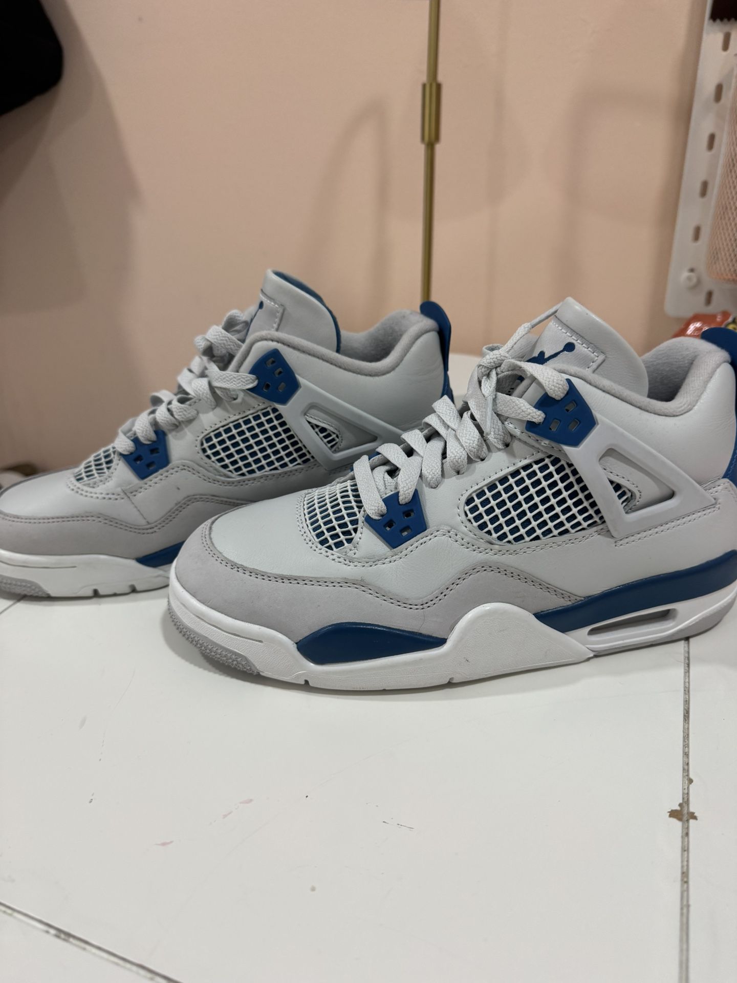 Air Jordan 4 Military Blue sneakers. Only worn once, so they are in excellent condition. Very clean and look almost brand new. No box included. Perfect for anyone who likes Jordans. Message me if interested!