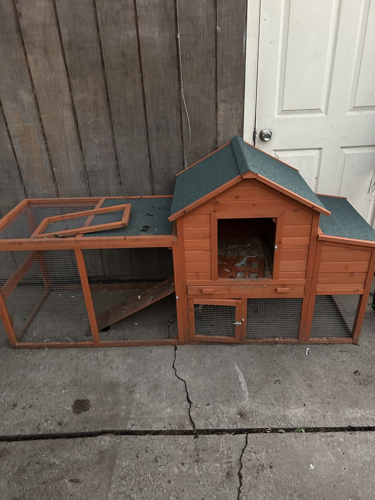 Good for 4 chickens Length 80 inches Height 40 inches the big door is missing aswell as some hardware eg; screws and latches