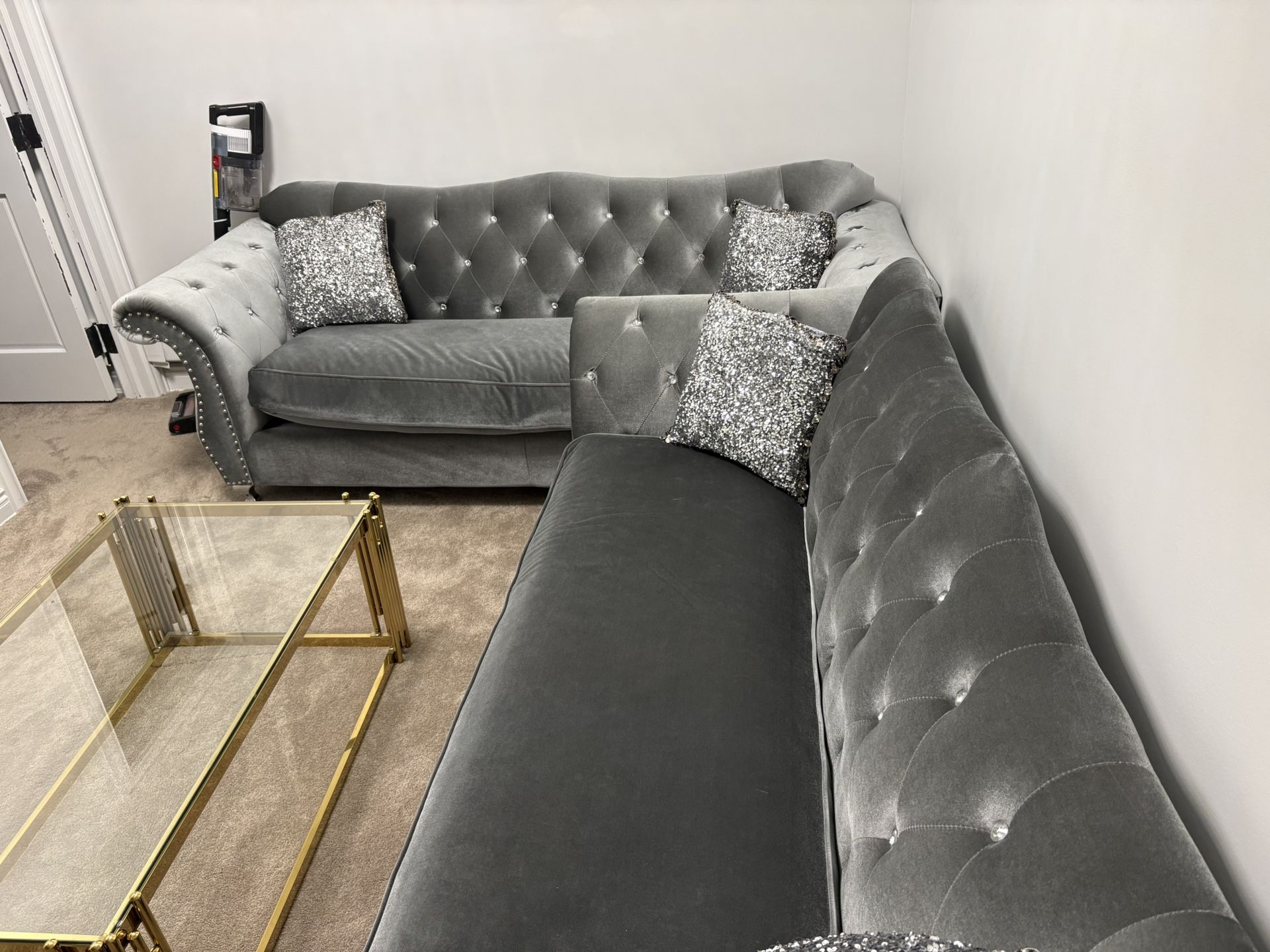 Elegant Gray Velvet Tufted Sectional Couch – Excellent Condition