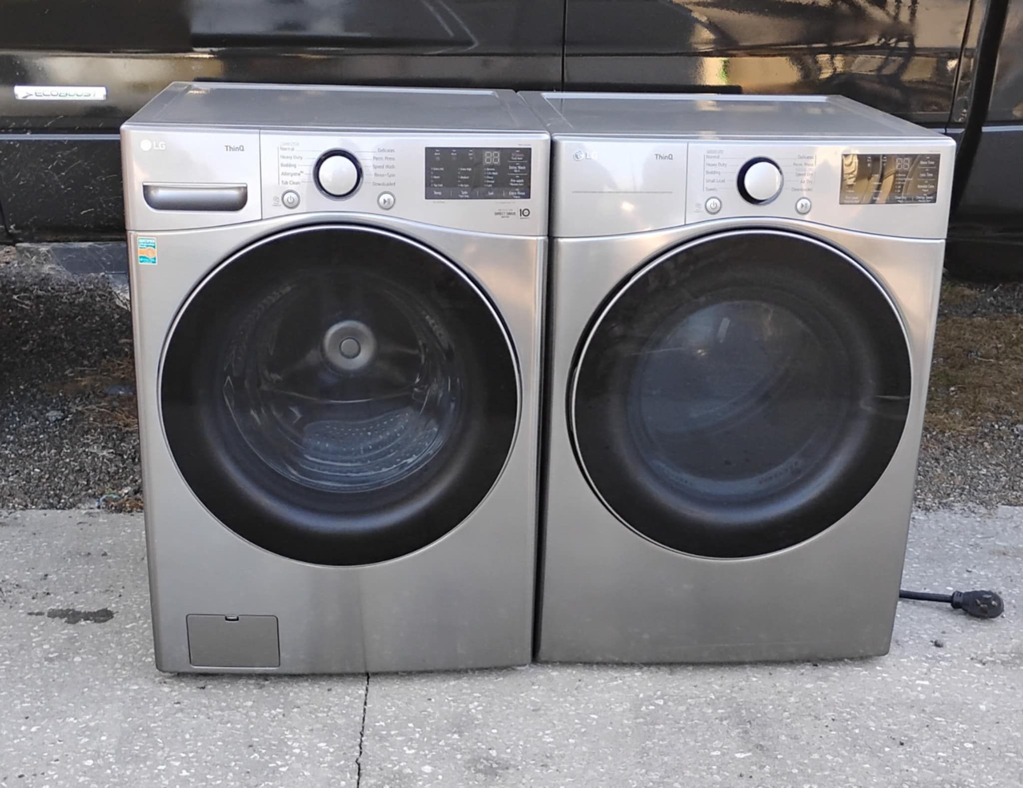 Clean LG ThinQ washer and dryer set. Front load design. Silver color. Washer has Direct Drive 10. Great for modern laundry room. Delivery π and installation available 30 days warranty