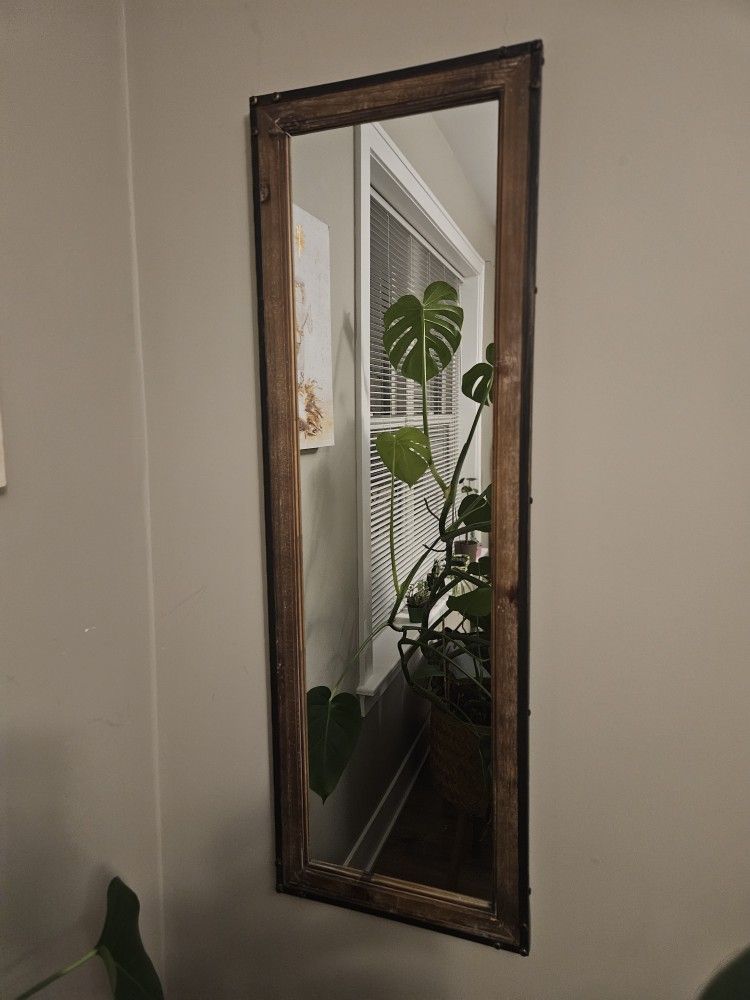 Rustic, vintage wood-framed rectangular wall mirror. Metal and wood. Good, heavy quality. 14"W x 42"H OBO