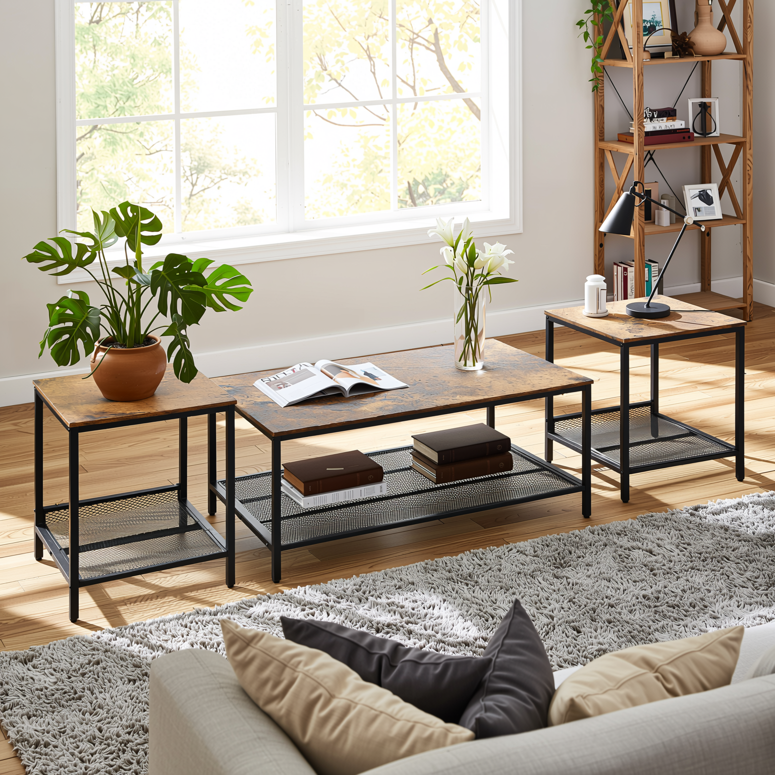 Homy Casa JOES 3-Piece Coffee Table Set, Wood & Metal, Modern Industrial Style