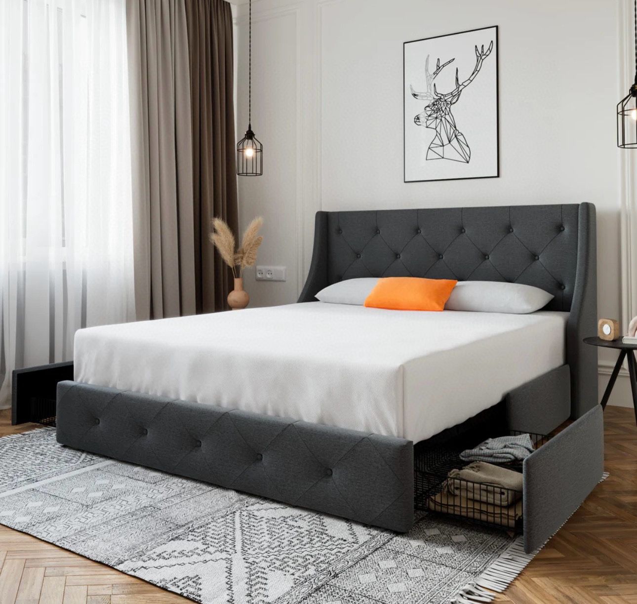 O211 $140 Upholstered Full Size Platform Bed Frame with 4 Storage Drawers and Wingback Headboard, Diamond Stitched Button Tufted Design, No Box Spring Needed, Dark Grey Material Linen Product Dimensions 79.7"L x 57.9"W x 40.55"H Style Modern Special Feature Storage , No Box Spring Needed , Wingback , Sturdy Structure Color Dark Grey ROOM-SAVING DRAWERS: The bed has four steel drawers locked underneath. The storage drawers are very easy to move with four small but convenient wheels. The storage bed offers perfect storage space for your clothes, bedding, shoes, etc KEEP MATTRESS STAY: Giant wingback headboard helps to keep your mattress stay in bed and prevent your pillows from falling STURDY STRUCTURE: Strong wooden slats and durable steel structures of our storage bed make it lasting. The maximum capacity is 800 lbs. No Box Spring is required EASY ASSEMBLY: The bed frame comes in only one package with all the tools and clear installation instructions, making it easy to assemble in less than 30 minutes NOISE-FREE DESIGN: EVA mute strips on the metal structure ensure no squeaks when moving around. Silent pads at the foot of the bed protect the floor and reduce friction noise She037227