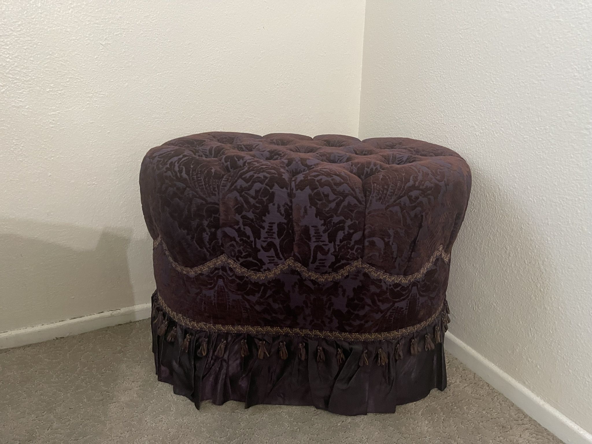 Hand made antique velvet sitting chair. Can be used as a make up chair, closet foot stool or decorative piece. Paid $750 new Used for display Matching pillows available 22 inches wide by 17 inches tall