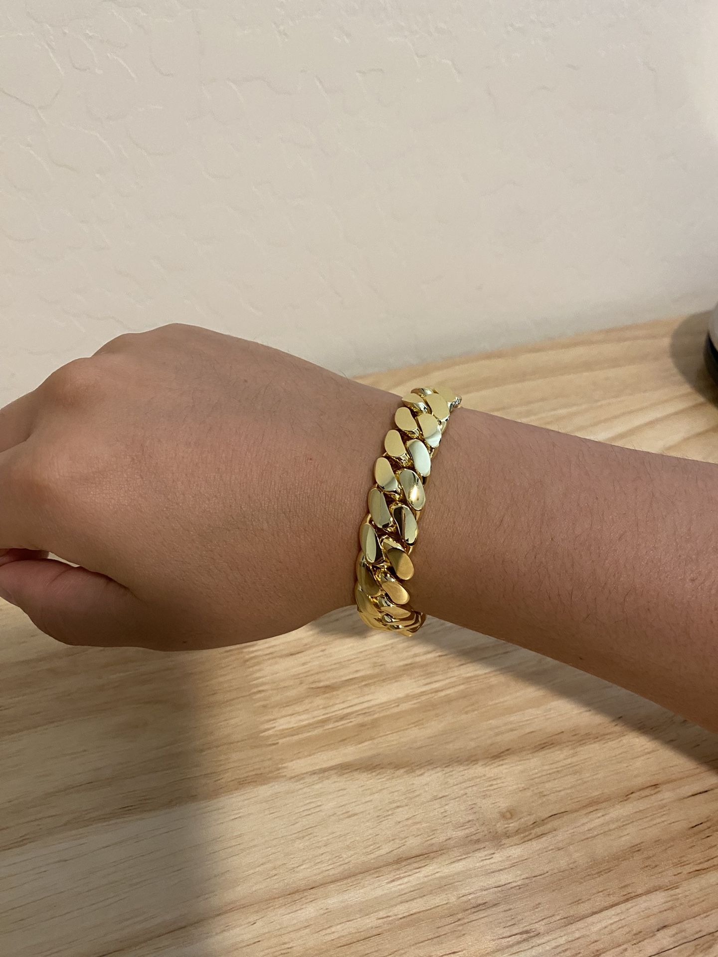 Solid Handmade beautiful miami cuban link bracelet plated in real 14k gold. I have different sizes. The size in pictures are 20mm - $180 15mm - $170 10mm - $160 (smaller last picture) I have larger thicker sizes available as well. 18-24mm These chains are plated with thick layers of genuine 14k gold for a luxurious gold shine. Bracelet is solid and heavy. HAVE matching necklace as well if needed. Buy the set and get a DEAL.