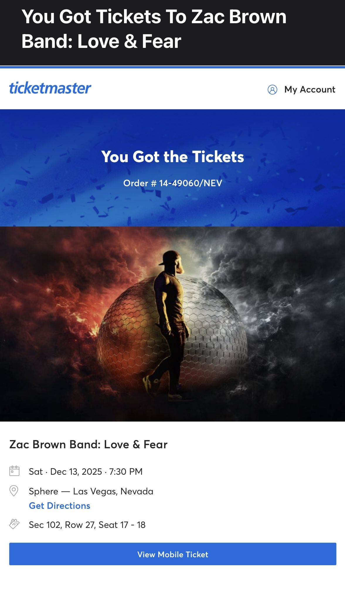 Two tickets to see Zac brown band at the sphere on 12/13. Section 102 row 27. Best offer takes them. Can verify through ticketmaster. Went last night and it’s amazing!!