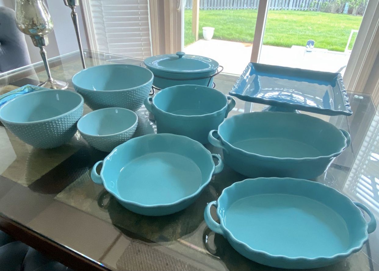 Turquoise Serverware Set (4 Serving Dishes and One with cover, Bowl set, Cake Stand)