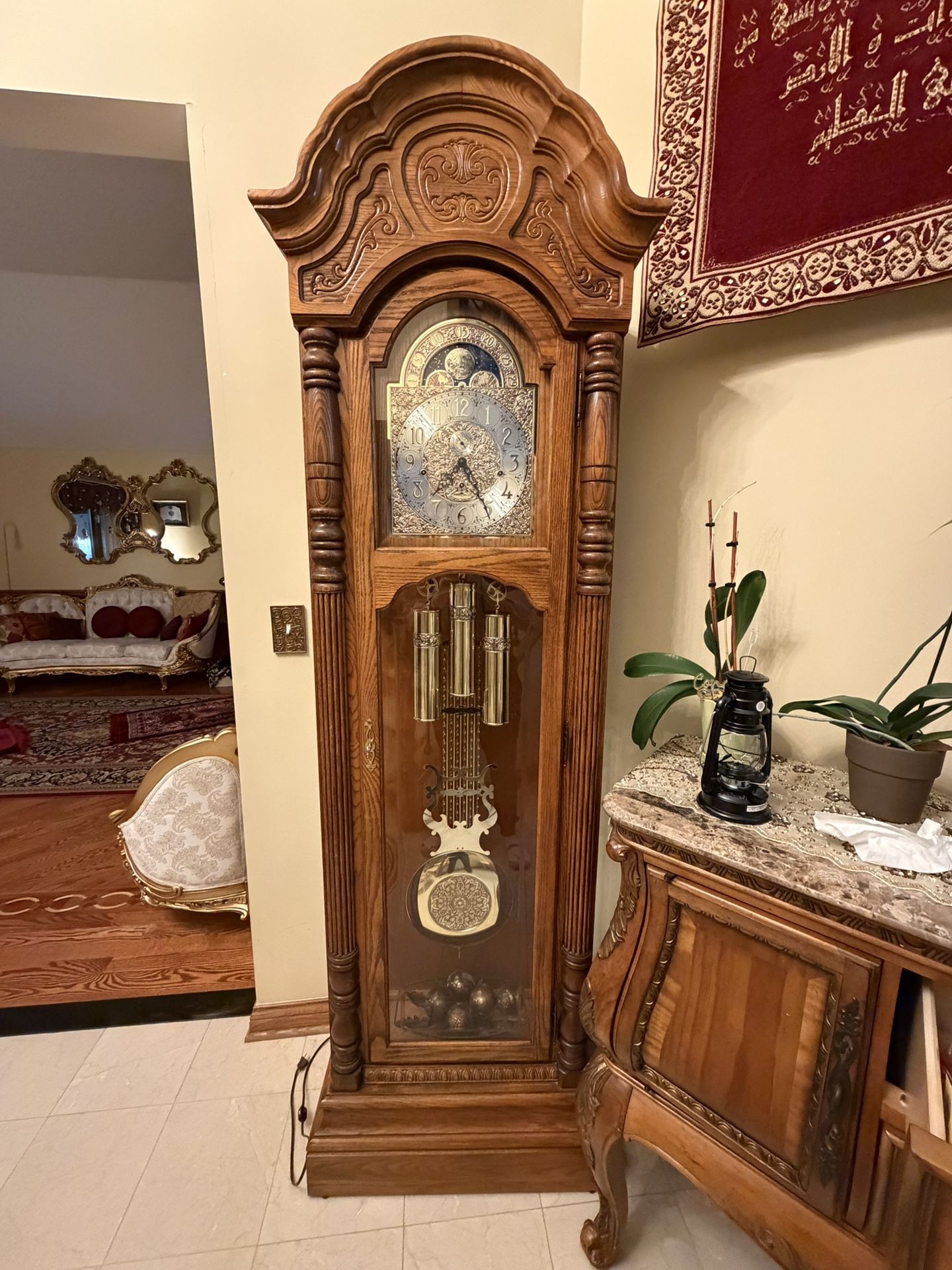 16 x 27 x 88 inch Grandfather Clock by Howard Miller. Model 610-808 Looks brand new, just do not have space for it anymore, and the clock does not move anymore