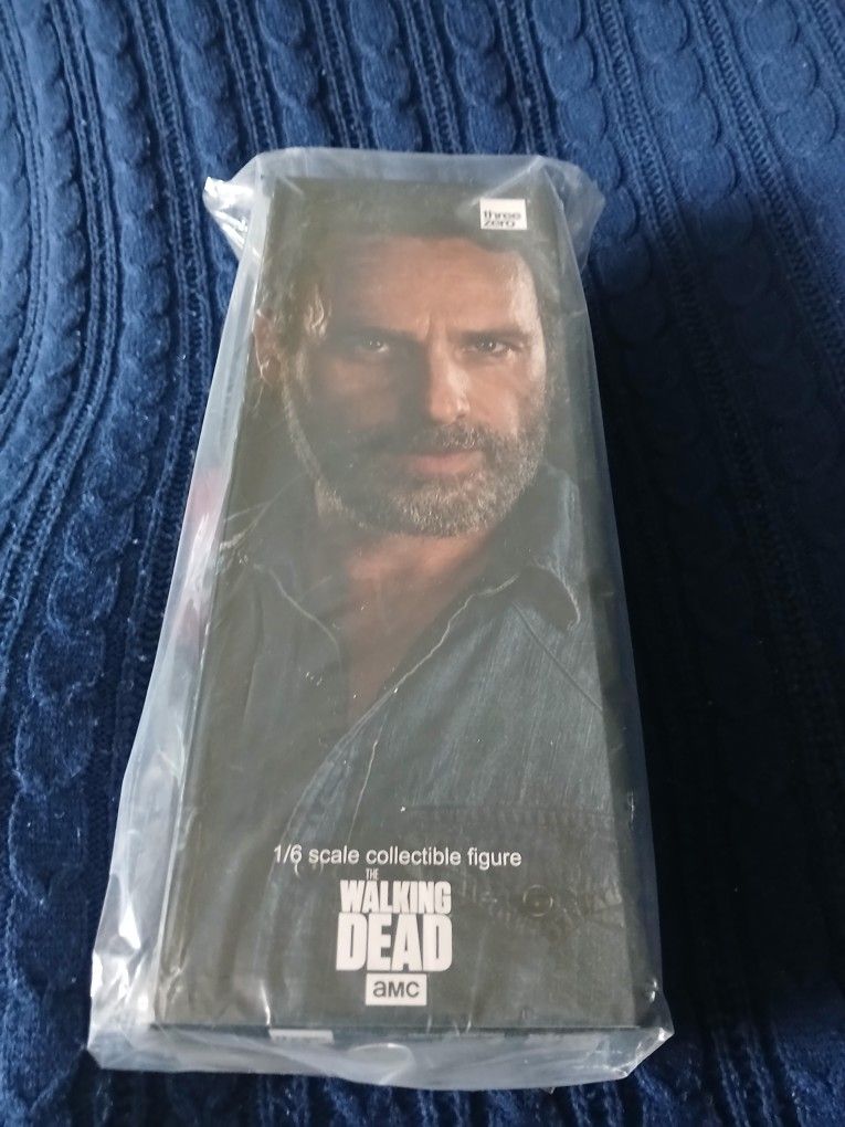 The Threezero 1/6 Rick Grimes figure is a 12-inch action figure from season 7 of The Walking Dead. It features a lifelike head sculpt with gray and white paint effects that depict Rick's aged appearance. This figure is brand new for fans of The Walking Dead. Includes different guns and hands. Never opened or displayed.