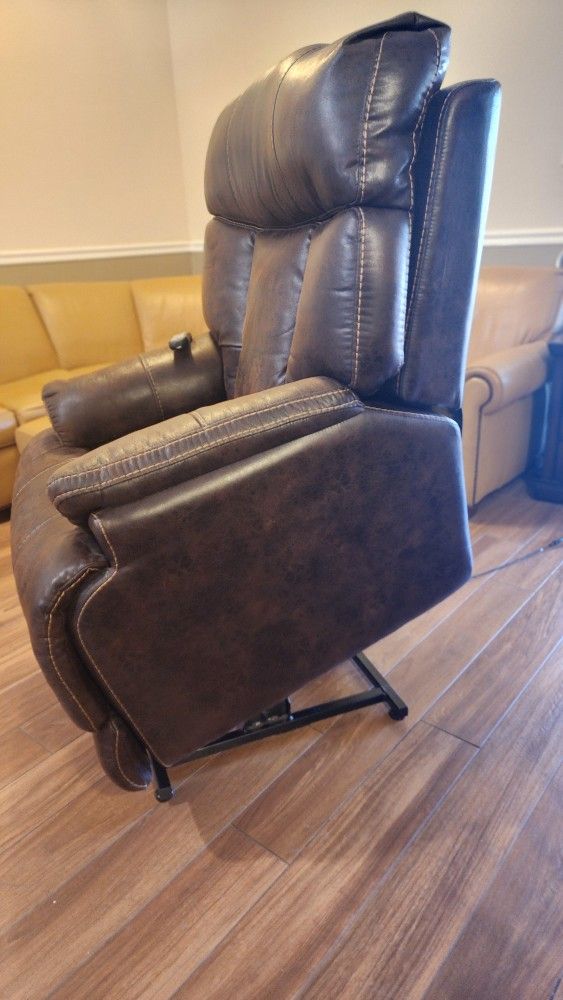 XL brown recliner lift chair with remote. Great for lying flat to sleep. Lift chair mechanism works well. Buyer must bring help to scoot chair out of home and into vehicle. Comes apart in 2 sections. Owners are non-smokers; no pets have been on the chair.