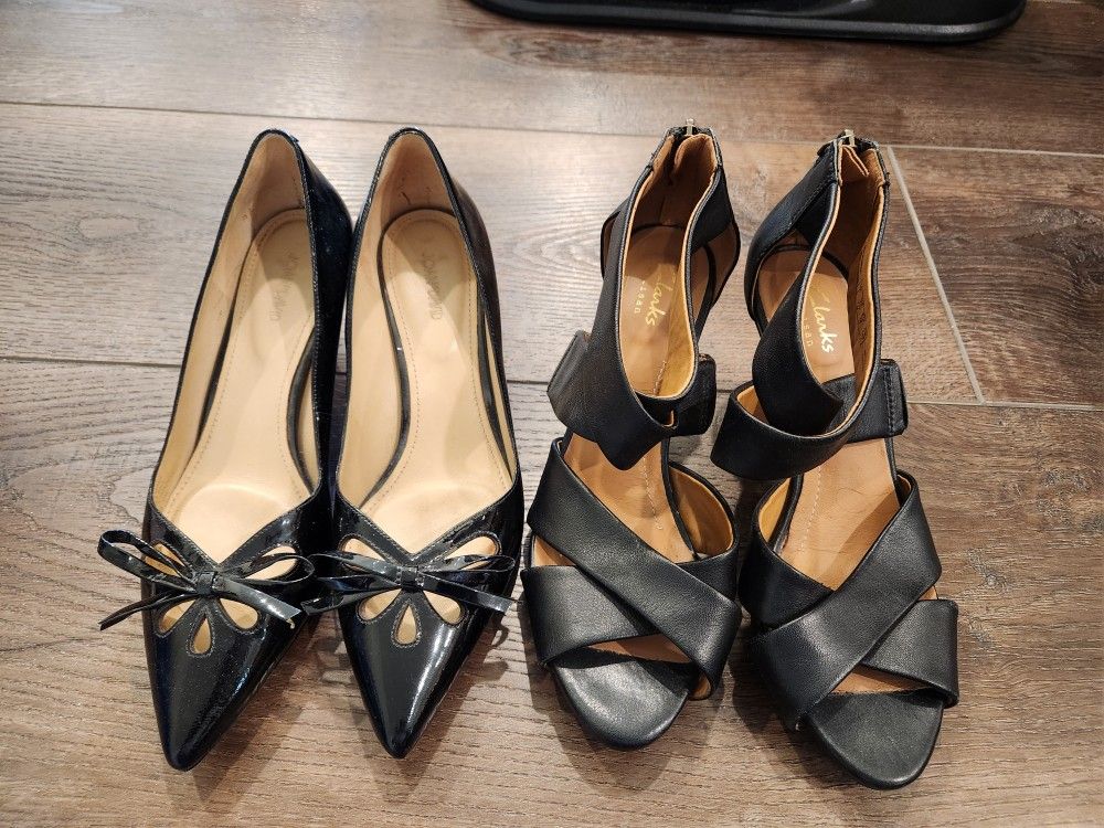 2 pairs of 7 1/2M shoes black patent leather pumps by Joan and David, black strappy sandals by Clarks, good condition