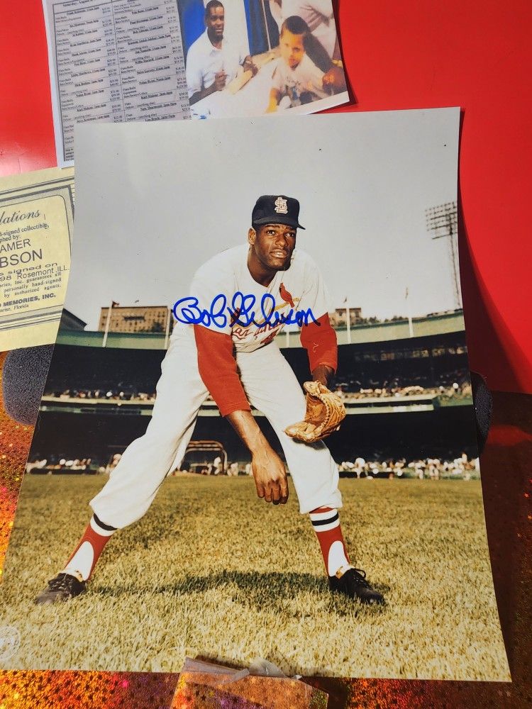 Bob Gibson St Louis Cardinals Autographed 8x10 W/Coa, photo schedule of show & TOP LOADER