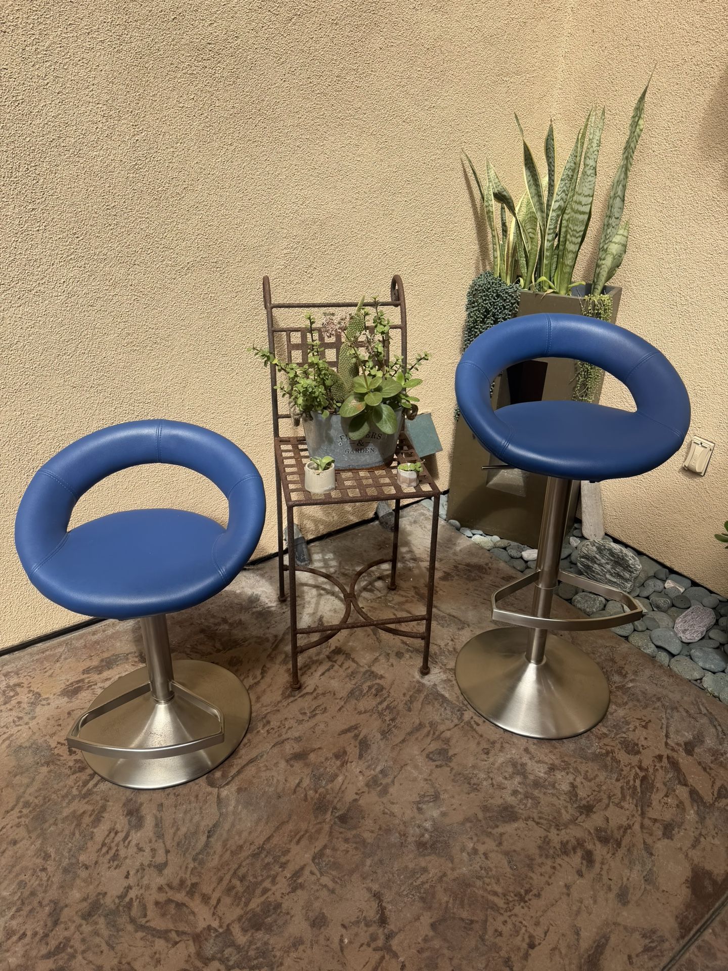 A pair of ZURI Dark Blue Crescent Adjustable Height Swivel Armless Bar Stool Purchased 4 years ago. Limited use. Fully functional. Doesn’t match with current home decor. See pictures and Amazon link below for more specifics. https://offerup.com/redirect/?o=aHR0cHM6Ly9hLmNvL2QvMGoyeTViZnc= Chairs have surface rust on bases, result of being near the coast for the last year. See pics in ad.