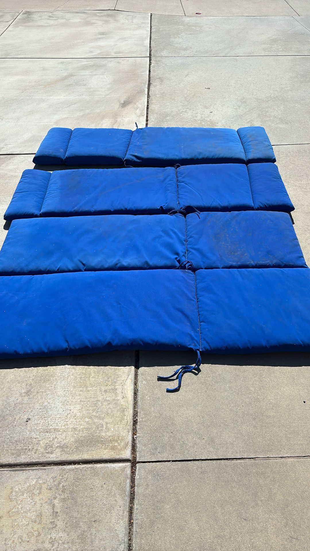 Four blue outdoor cushions for chaise lounge chairs, ties for securing to the chair, measurements are 72 x 22 x 7, in good used condition but need a good hosing down, in the Orangecrest area of Riverside, take all 4 for $12 total