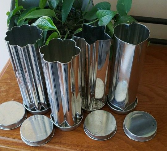 The Pampered Chef Set of Silver Metal Bread Baking Molds (4 total) Set of silver metal baking molds. Perfect for creative baking projects. Shapes include star, heart, & 2 scalloped circles/flowers. Great for baking bread & slicing thin to make cute sandwiches for special occasions. Measurements: 9" x 3" Lots of life left, signs of wear from normal baking use. See pictures for details. Cash only please