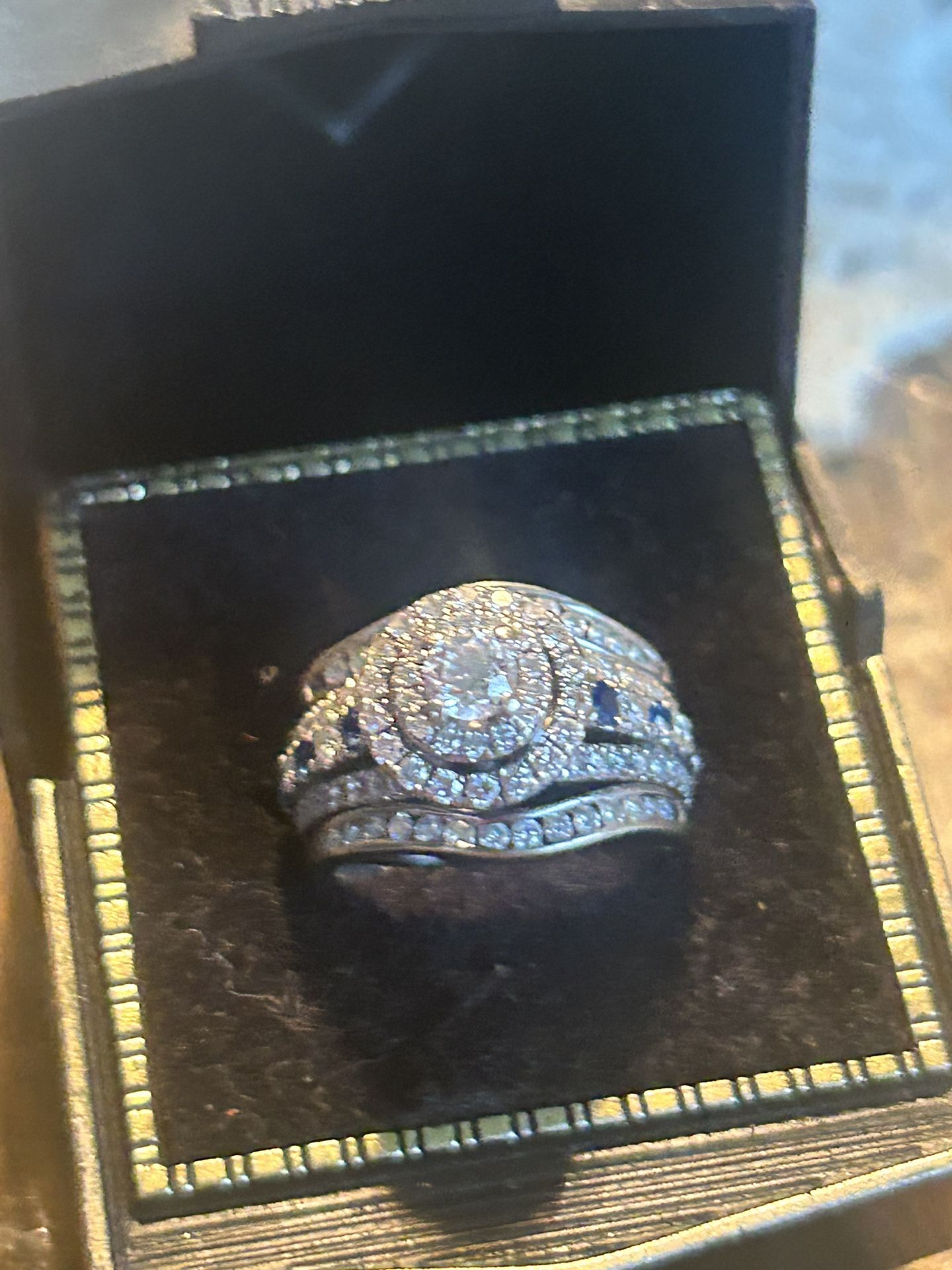 This is a brand new set wedding ring set with earrings 14 kt and diamond s for wedding rings and 14 kt earrings Didn’t get married bought Kay’s Jewelry, size 6 or 7