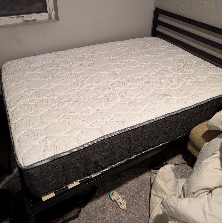 Full size mattress and bed frame, used around 10 times so it's clean and like new, you can have the sheets too if you want them. Willing to sell separately if you only want one item not both.