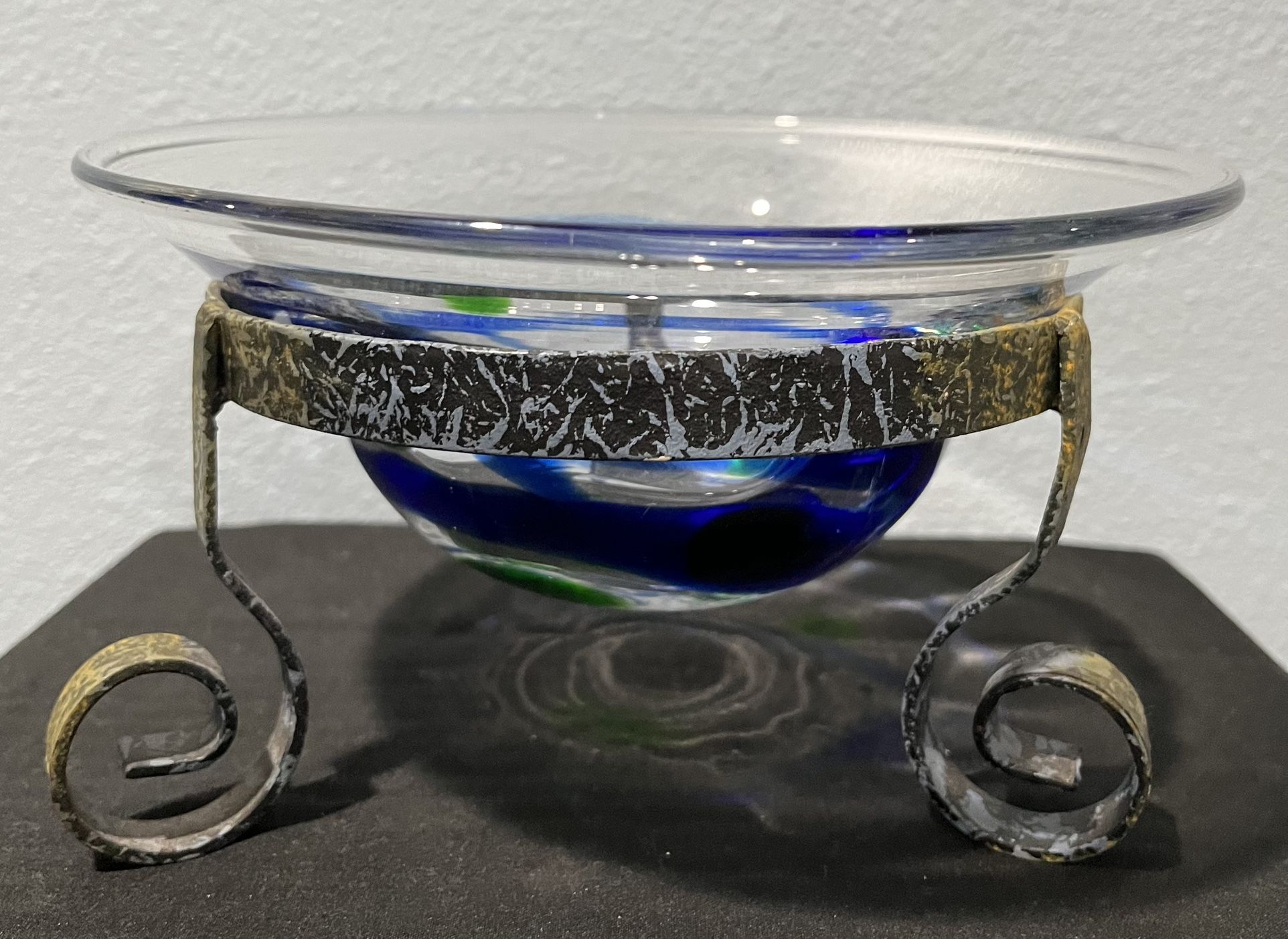 3pc set decorative glass bowl and candle holder set dynamic blue and green colors within the glass with stands.