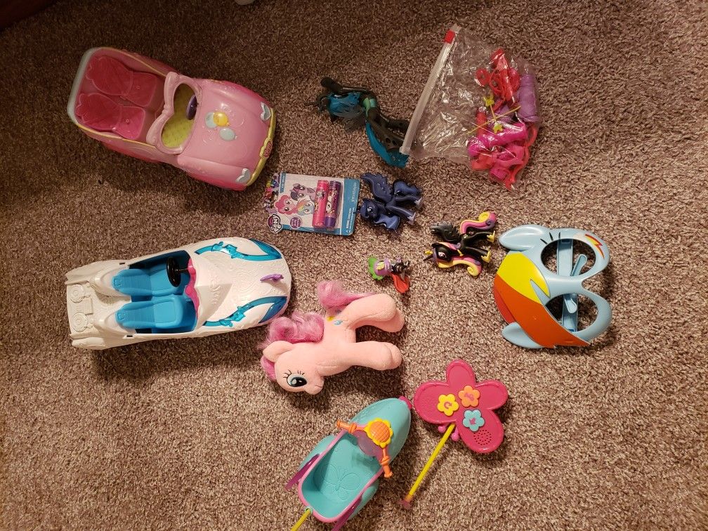 Rainbow dash and pinkie pie and twilight plush, remote control car, two cars from the DJ pony and pinkie pies car, figures with baggie of things to dress them up plus mods misc, see pic